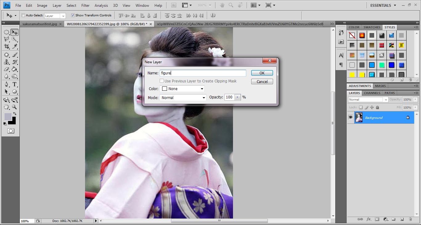 Double-click on the layer thumbnail to unlock it and make it as layer and name it as "Figure".Apply "Image >> Auto tone" and "Auto contrast" to the "Figure" image and also refine the image with Blur tool to smoothen the white foundation on figure face. I also use the Clone Stamp tool to retouch the white colour make-up on the figure's ear and neck.