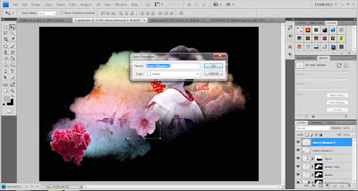 Repeat the steps just now that we use to hidden the unwanted part of background dancer under vector mask [Ctrl + click on the layer thumbnail of background brush to load selection of the cloud-like shape.Back to the layer of background sakura 1 and click on the add vector mask]. Set the opacity to 40% and change to soft light mode.